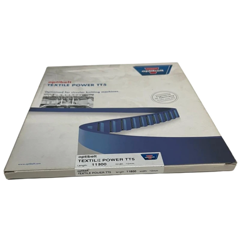 Correia com arco fechado sem emendas. Dentes trapezoidais com um ângulo de dente de 40° e um passo de 5mm. O poliuretano termoplástico azul com uma dureza de 92 Shore A protege os cordões de aramida de alta resistência. O reforço mais espesso na superfície superior da correia proporciona à correia dentada Optibelt TT5 TEXTILE POWER um bom atrito e excelente resistência a óleos e solventes, e é responsável por sua longa vida útil. Esta correia é projetada para altas velocidades e pequenos diâmetros de polia.