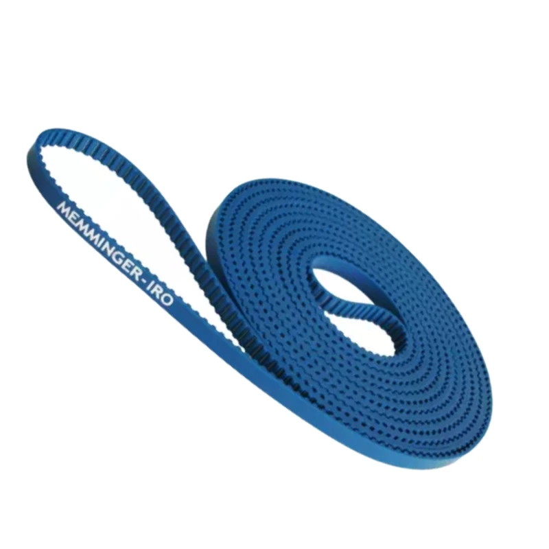 Correia com arco fechado sem emendas. Dentes trapezoidais com um ângulo de dente de 40° e um passo de 5mm. O poliuretano termoplástico azul com uma dureza de 92 Shore A protege os cordões de aramida de alta resistência. O reforço mais espesso na superfície superior da correia proporciona à correia dentada MEMMINGER TT5 um bom atrito e excelente resistência a óleos e solventes, e é responsável por sua longa vida útil. Esta correia é projetada para altas velocidades e pequenos diâmetros de polia.